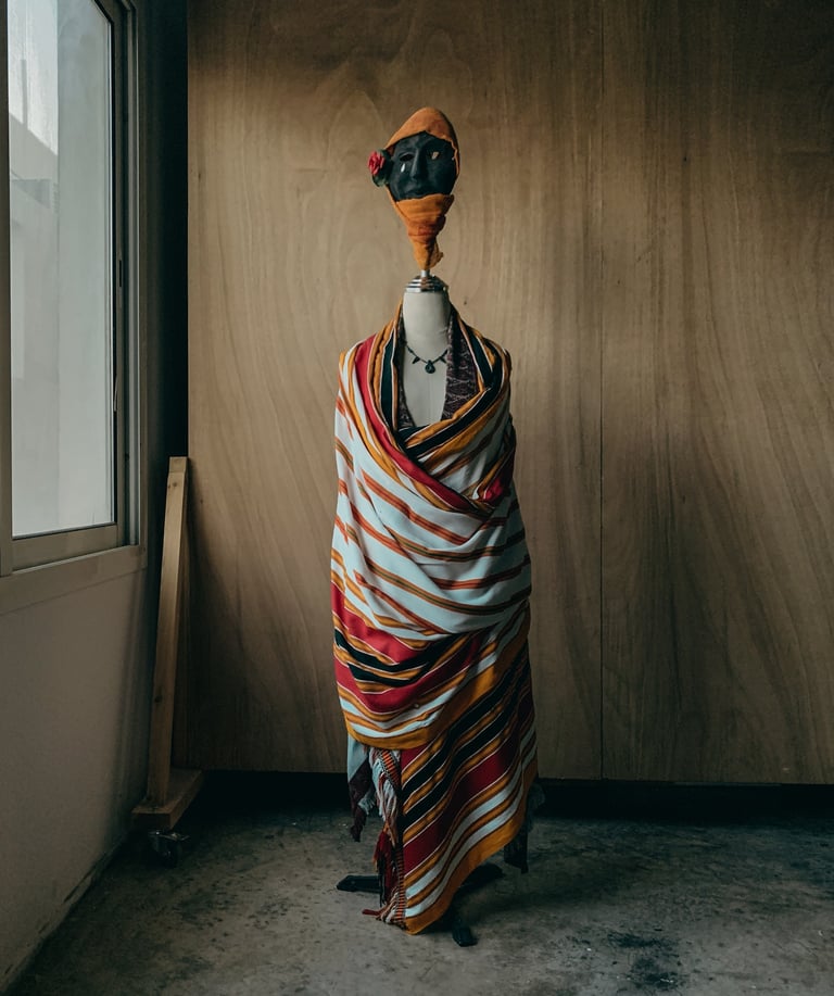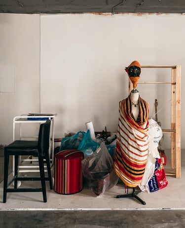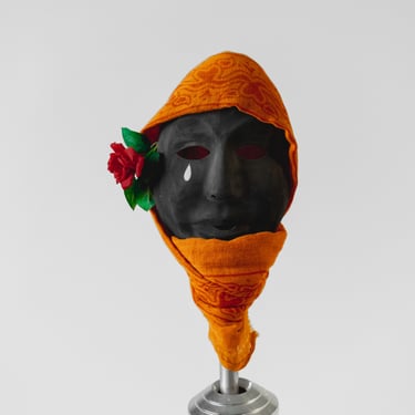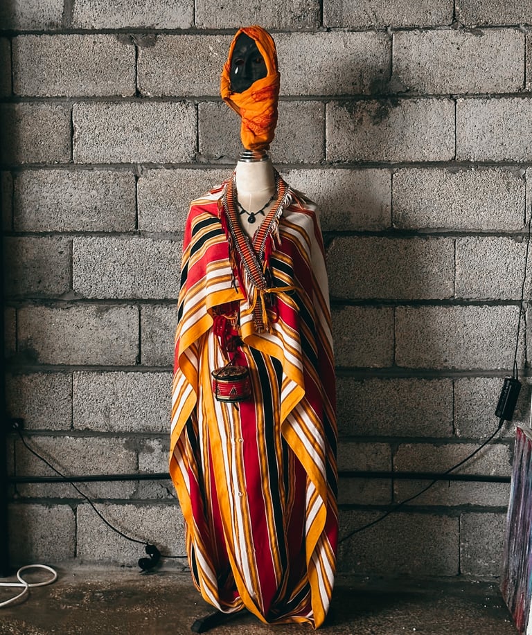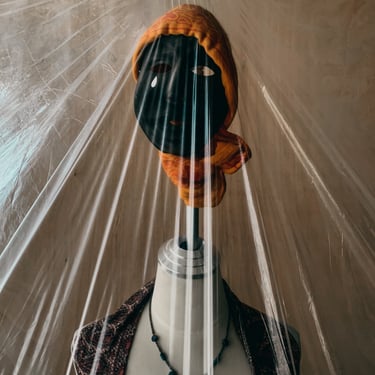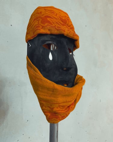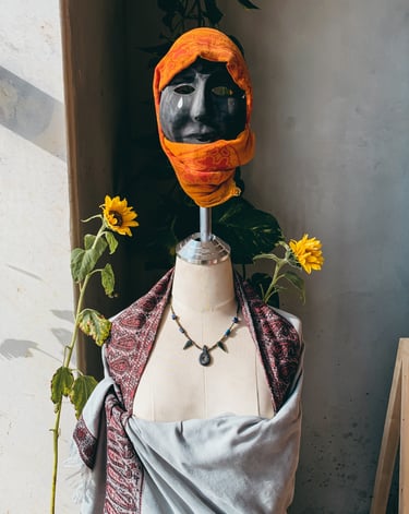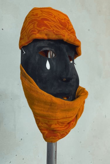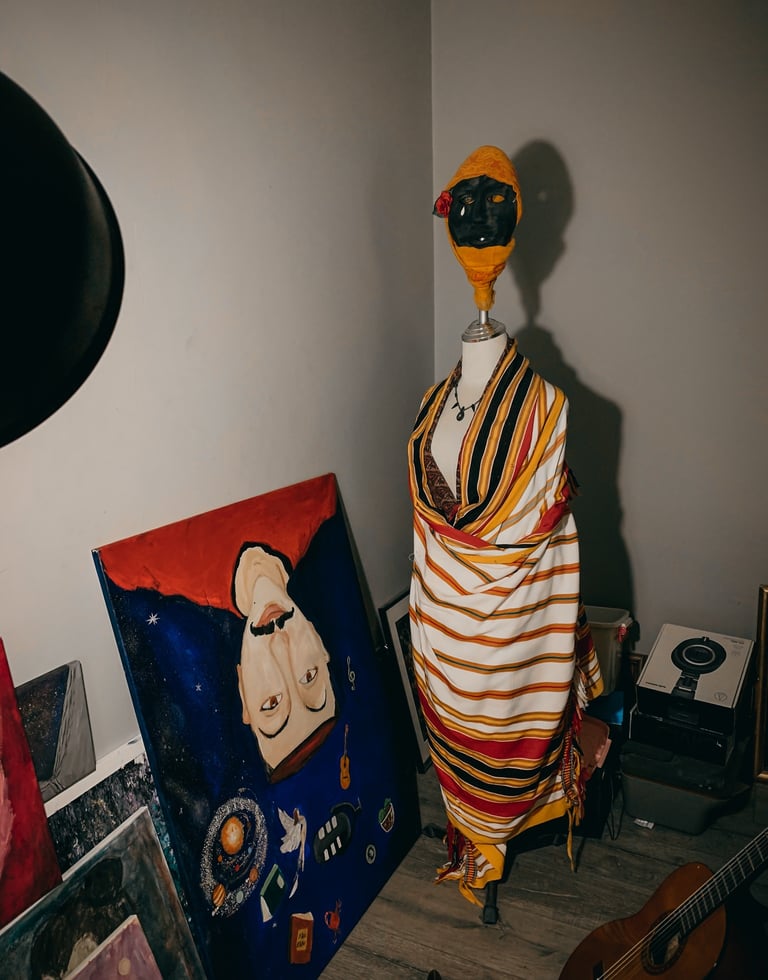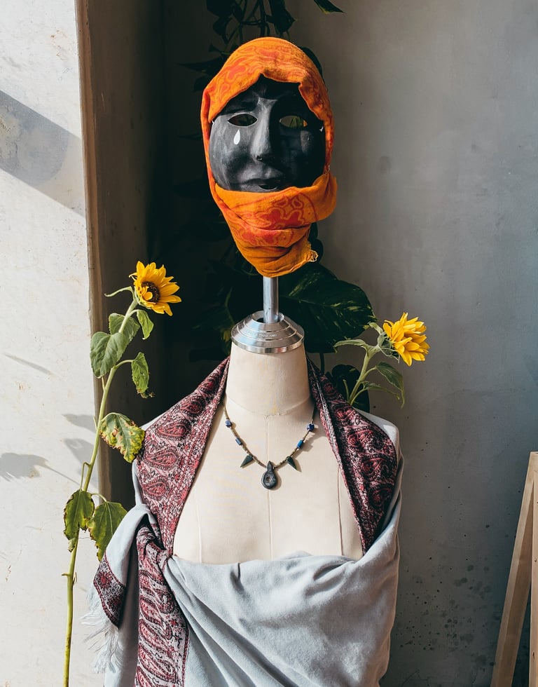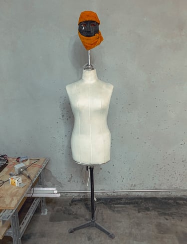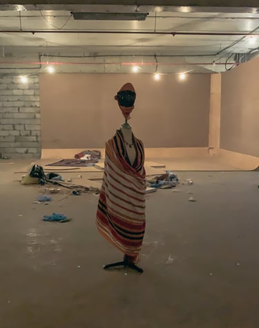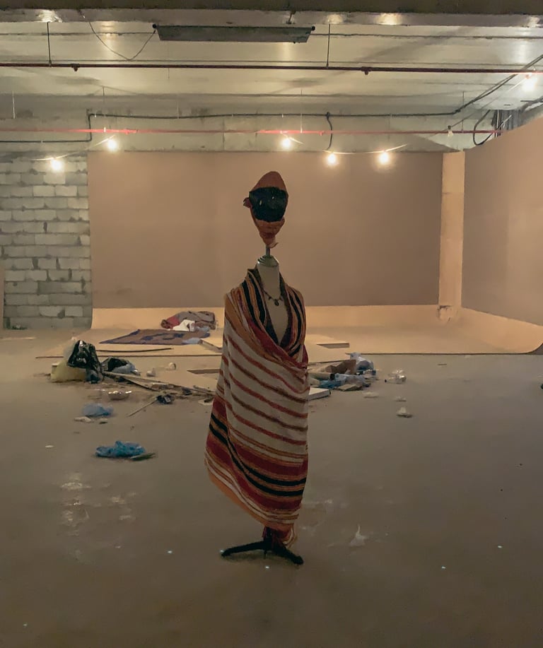 وعند دخولنا لأول مرة في المكان ، وجدت ذاك الجسد الذي لا حول له و قوة ملقى في المكان على الارض ، ومن دون شعور اخذت بها و رفعتها والبستها القناع الذي كان جزء من اول عمل فني لي وهو "منتصف" والبستها المنديل الأصفر كي تنتمي لبيئتي و ولدت كيان في 19-12-2019