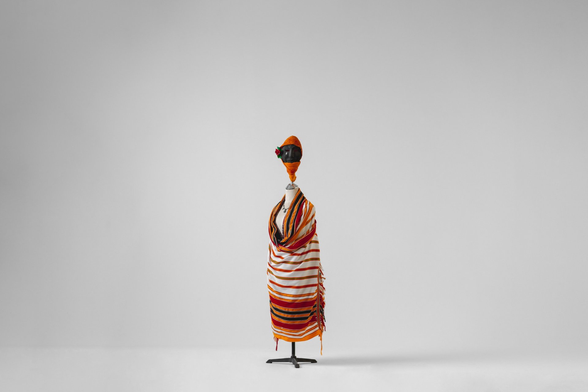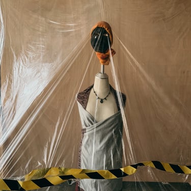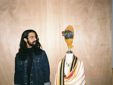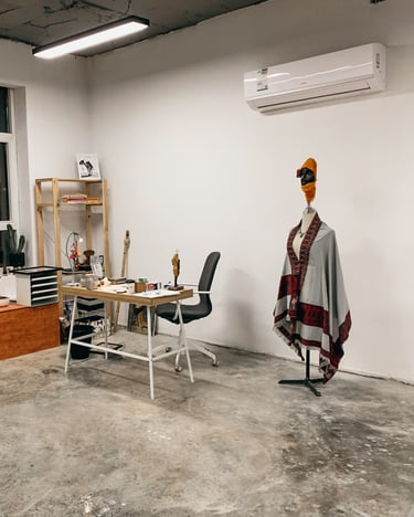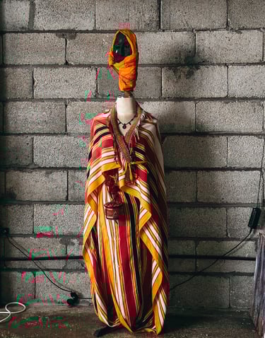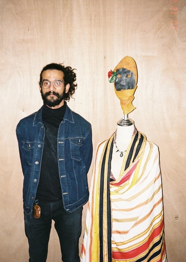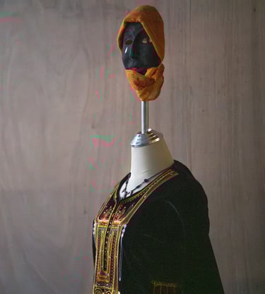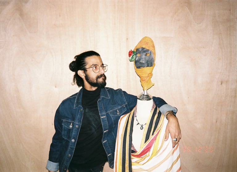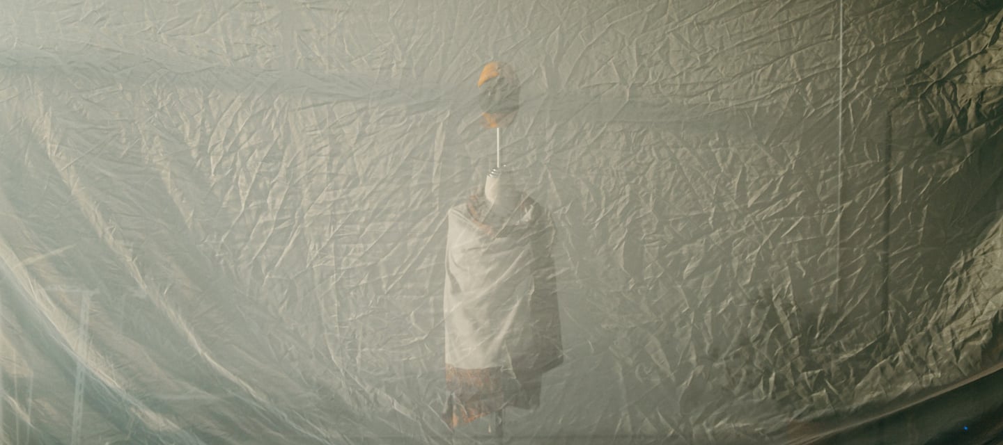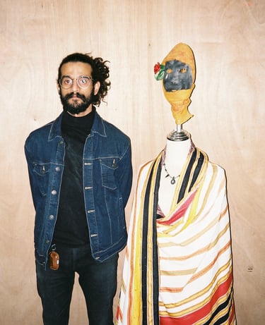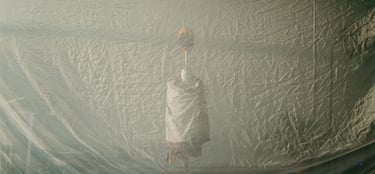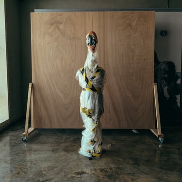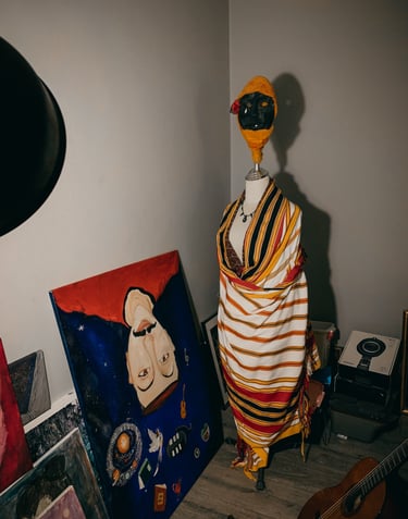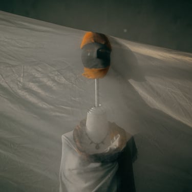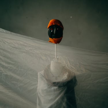 وعند دخولنا لأول مرة في المكان ، وجدت ذاك الجسد الذي لا حول له و قوة ملقى في المكان على الارض ، ومن دون شعور اخذت بها و رفعتها والبستها القناع الذي كان جزء من اول عمل فني لي وهو "منتصف" والبستها المنديل الأصفر كي تنتمي لبيئتي و ولدت كيان في 19-12-2019