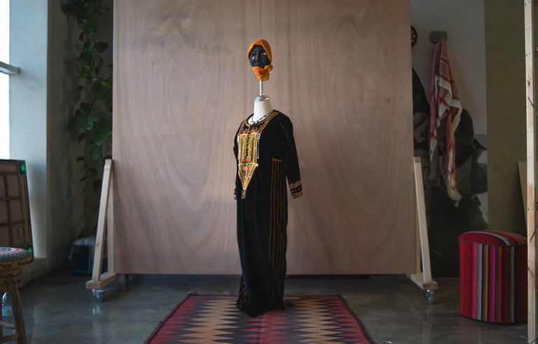 أصبحت كيان بالنسبة للمكان ، الجدة التي ترى كل شيء و تشير لك بالاعتدال بعينيها فقط ، هنا اردت ان أُظهر هذا الشعور الصادر منها بإرتدائها احد الملابس الخاصة بزي الجدات في جنوب الممكلة ، وصادف وجود الزي اثناء تواجد الفنانه "سمر المالكي" لإنتاج احد مشاريعها الفنيه في الإستوديو